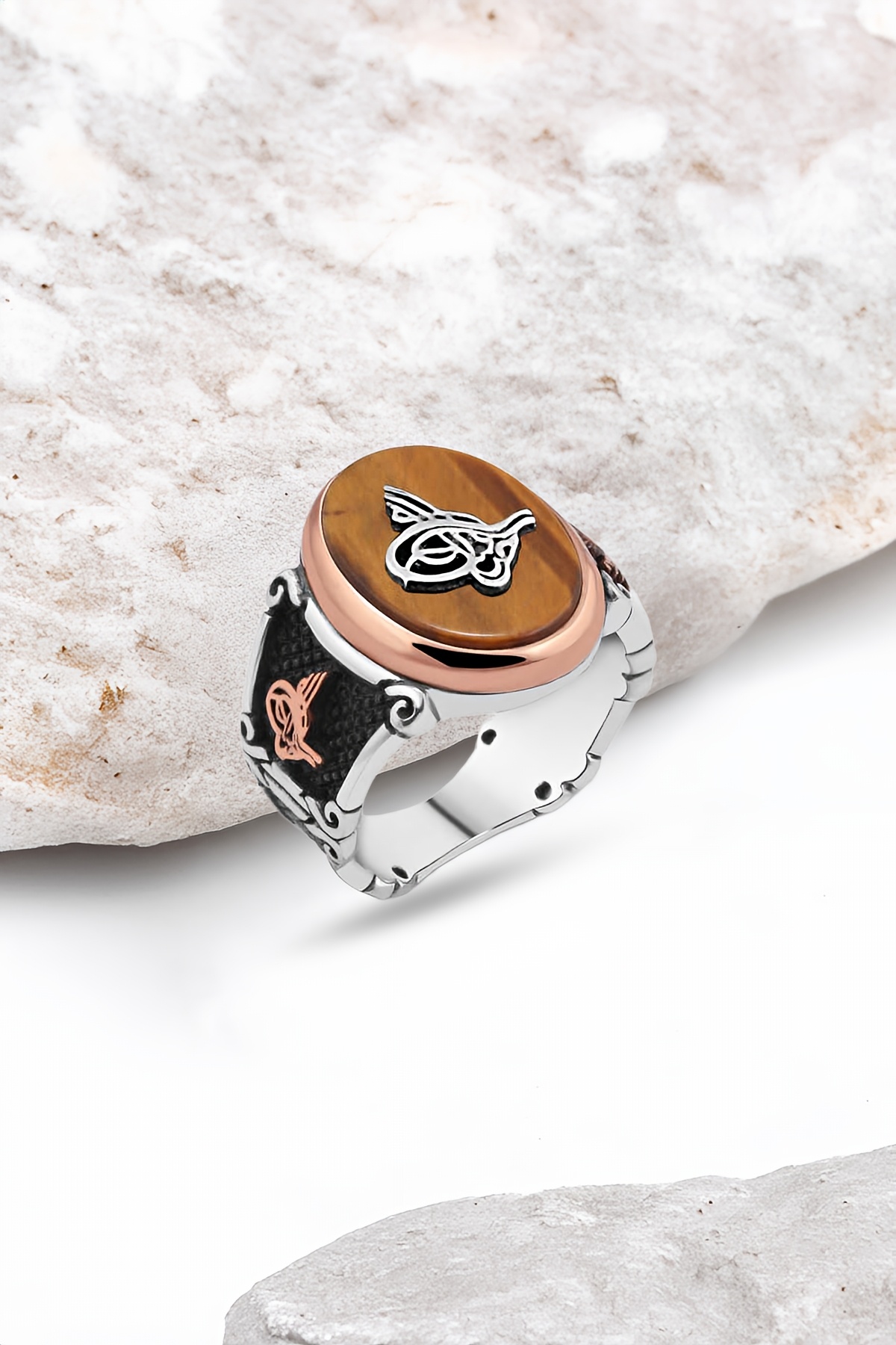 Kaplan Gözü Taş Üzeri Tuğralı Gümüş Erkek Yüzük